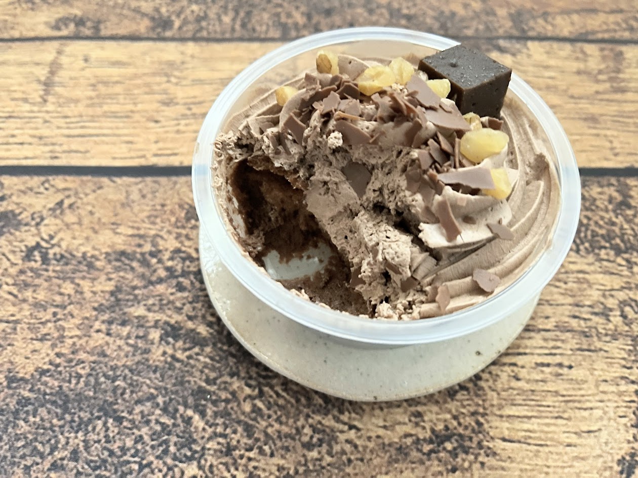 スポンジとホイップを重ねているせいか、パフェというより “ほぼケーキ” 。ムースとホイップがまろやかでなめらかで、お口のなかでとろける~! それに、トッピングのガトーショコラ生地が異様においしいです。これぞまさしく、コンビニで買えるご褒美スイーツですわ。