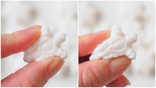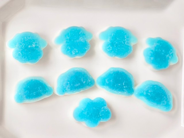 グミの形は、お顔形、雲に乗ったシナモン形、雲形の3種類。シナモンカラーの明るい水色がソーダ味、下の白色がヨーグルト味、とお味も2層になっています。