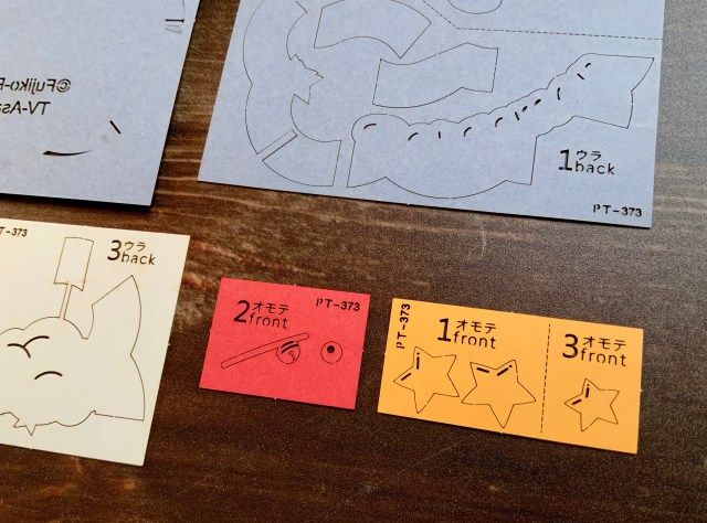 個人的にはこの作業が1番大変でした。なくしそう&壊しそうで、かなり神経を使います。ウラ・オモテの指示も切り離すとわからなくなるので、あらかじめ切ったパーツをそのまま置けるスペースを確保しておくとスムーズです。