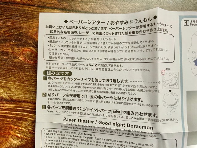 でも、無心で何かを作る時間は楽しいし、自分で作りあげたペーパーシアターは本当にかわいい! 価格はデザインによって異なりますが、「PT-373 おやすみドラえもん」は1980円(税込)でした。