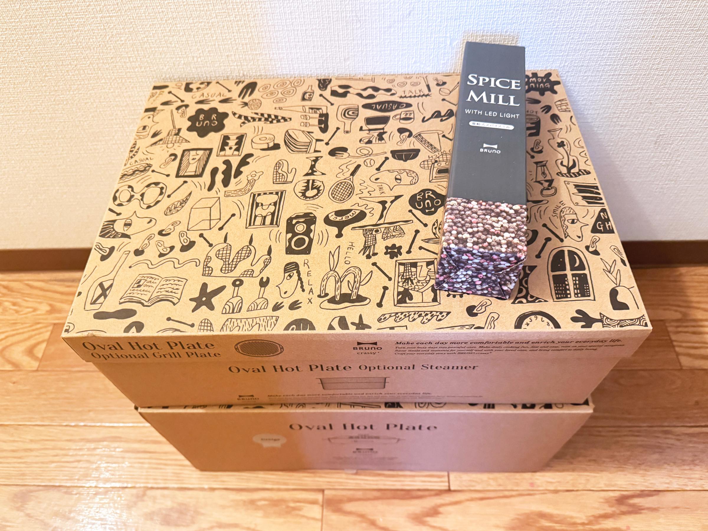貸出をお願いしたのは、BRUNO「2026年 オーバルホットプレート福袋」。こちら総額3万1240円のセットが1万9800円で購入できてしまうおトクな福袋で、到着した箱の大きさにまずびっくり! セット内容は以下の4点です。