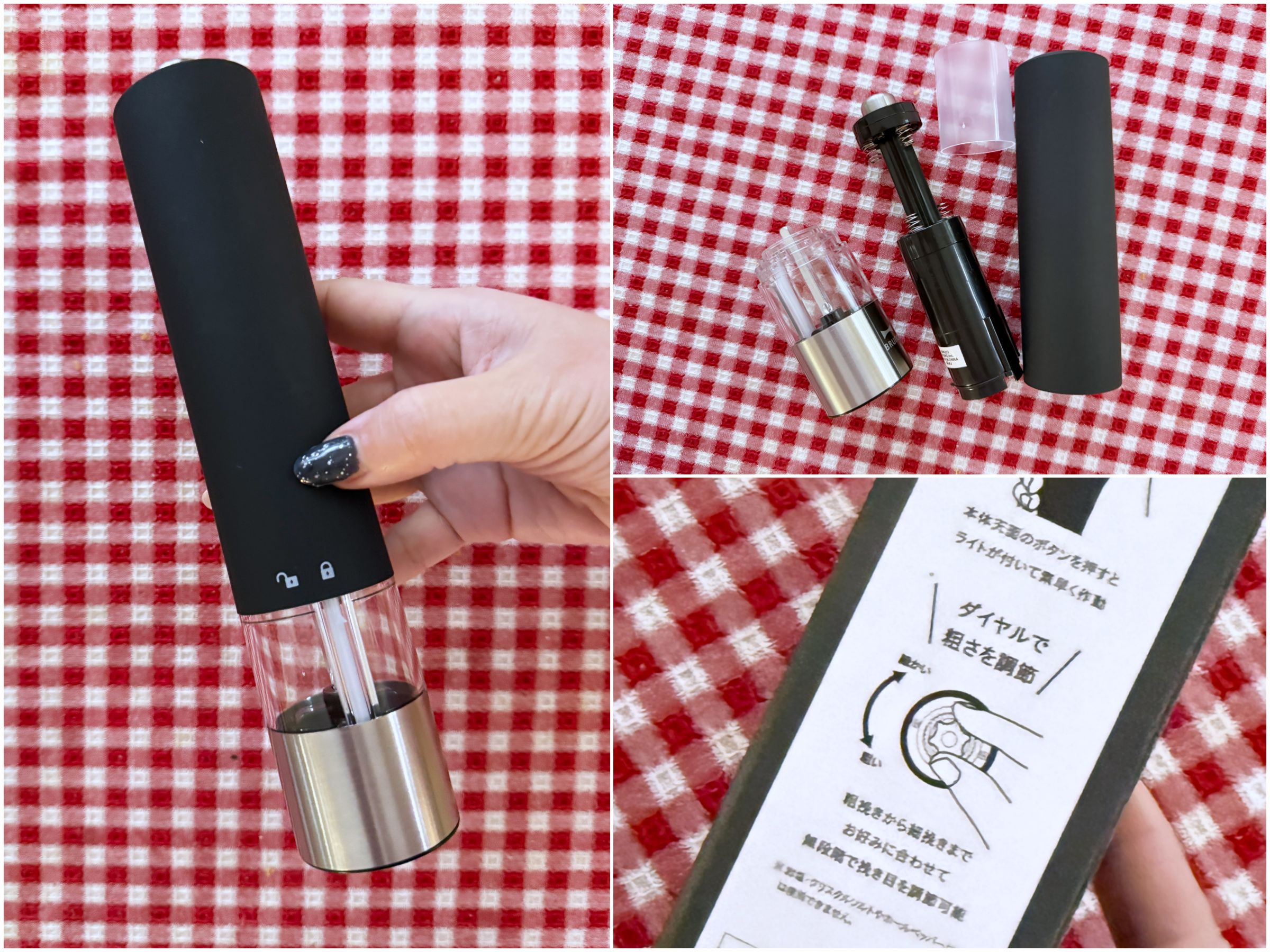 調理中でも片手でスパイスが挽ける電動ミル。LEDライト付き。ダイヤルで粗さの調整などもできるみたいです。単4電池を6本使用。