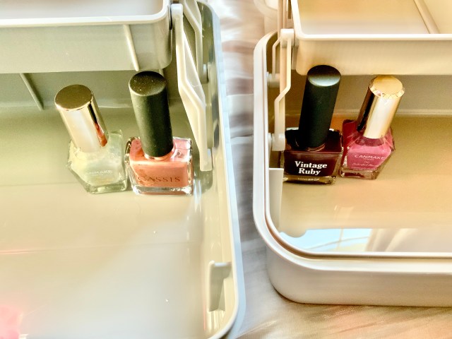 ネイル収納のために購入したという口コミを見かけたのでマニキュアを1番下の段に立てて入れてみたのですが、立てて入れると高さが足りないマニキュアが多いんです。