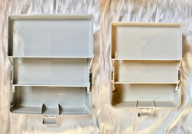 「ツールボックス」(1100円 / 以下、通常サイズ)は約縦15.5×横32.5×奥行き19.5cm、「ツールボックスミニ」(770円 / 以下、ミニサイズ)は約縦13×横27×奥行き17cm。どちらも3段収納です。