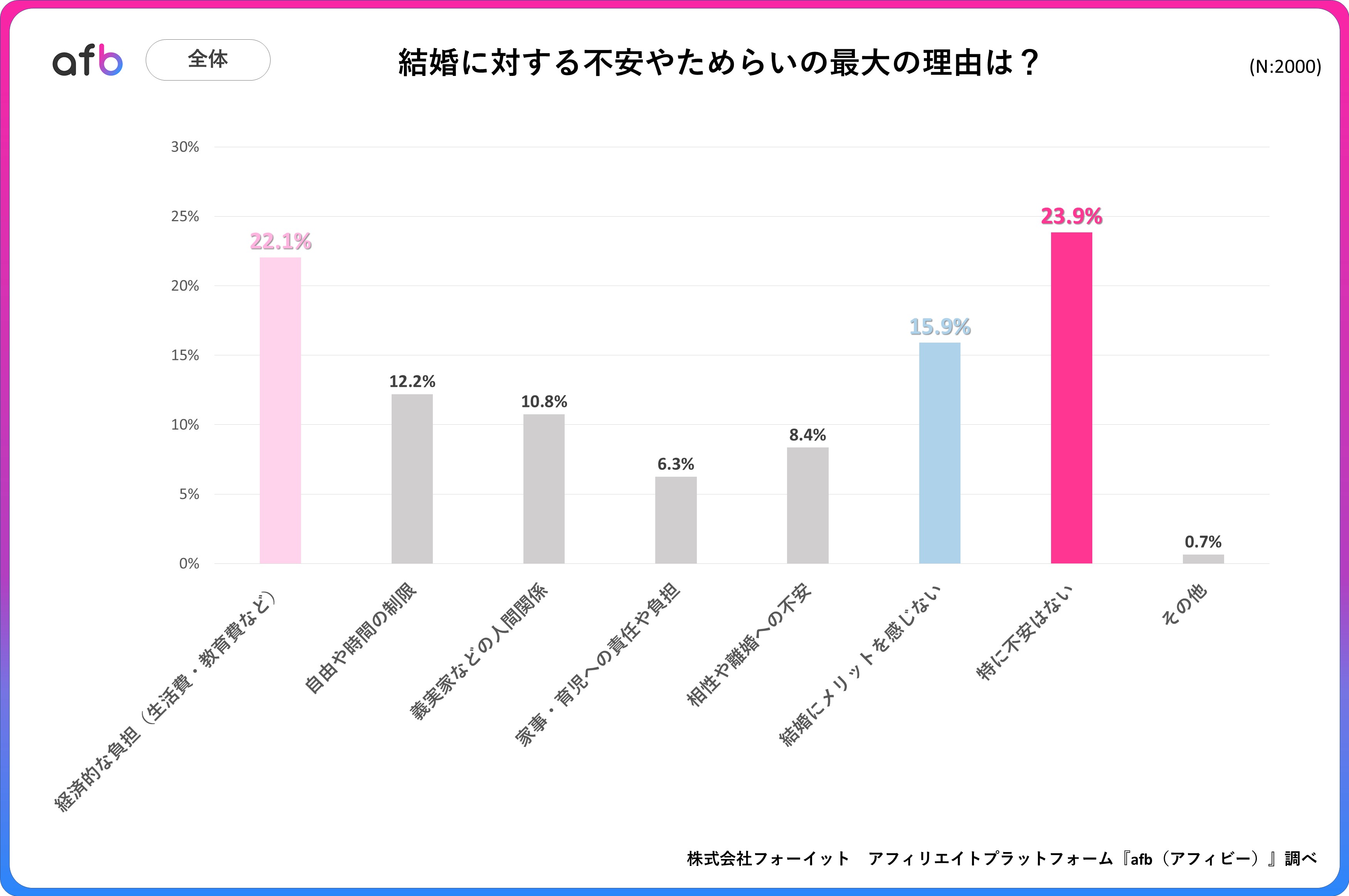 全国の20代~60代の男女2000名を対象にプラットフォーム「afb(アフィビー)」がおこなった調査によると、結婚に対して不安やためらいを感じる最も大きな理由は「経済的な負担」(22.1%)でした。