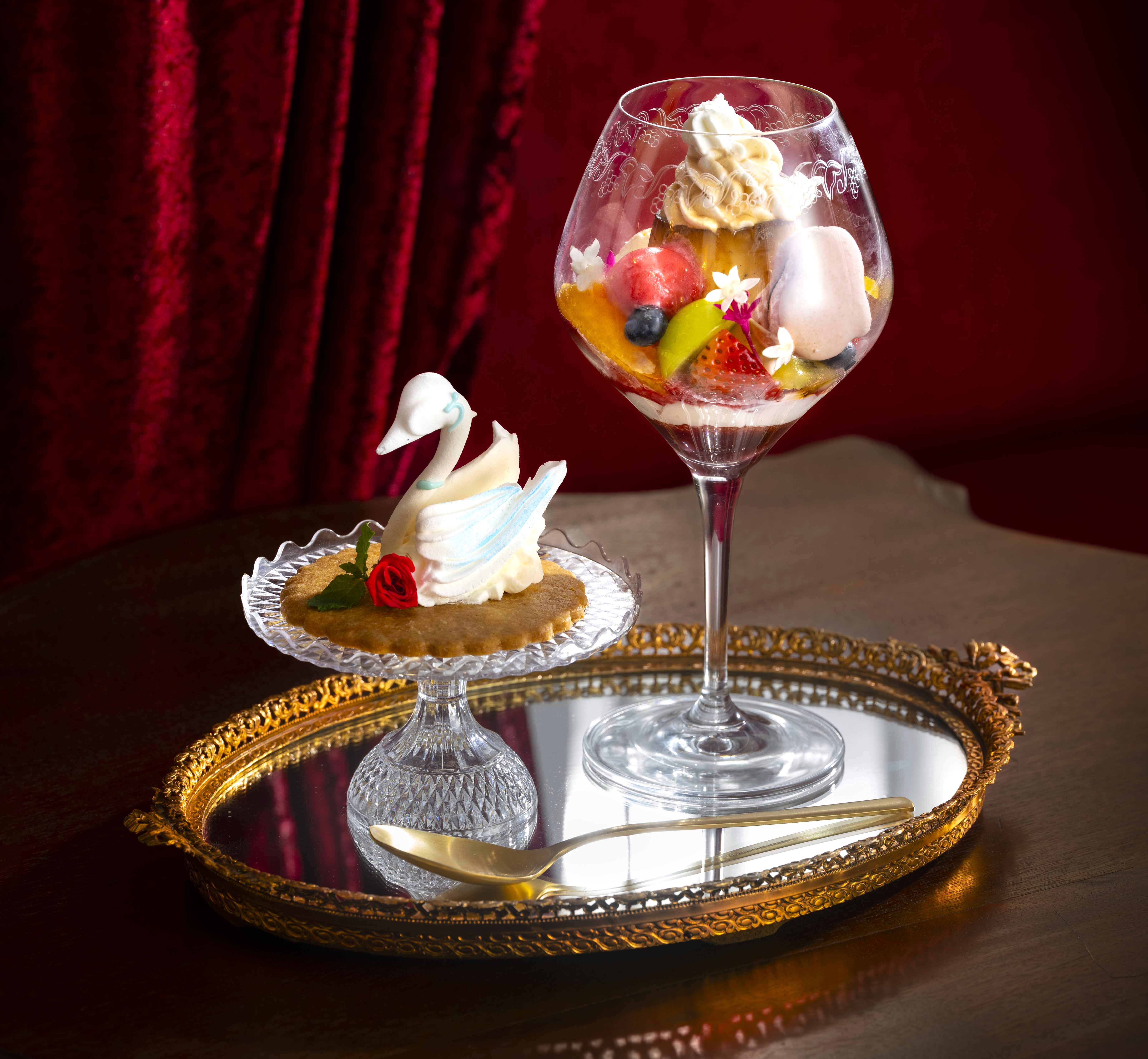 上部:メレンゲと生クリームでつくられた白鳥+マカロン+フルーツ(苺やシャインマスカットなど)