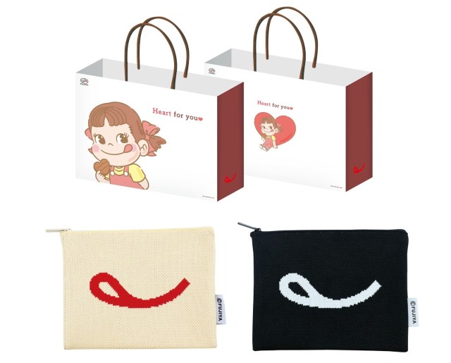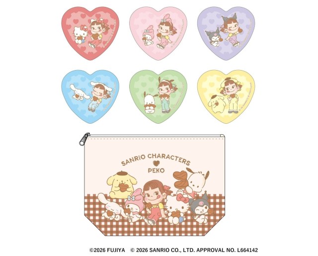 また、「トレーディングハート缶バッジ」や「マチ付きポーチ」など、ペコちゃんとサンリオキャラクターズのコラボ商品も多数登場予定です。