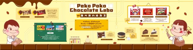 研究所に不二家のチョコレート商品が大集合した展示パネルが登場。研究員姿のペコちゃんと一緒に不二家の人気商品を見て、学んで、楽しめます。