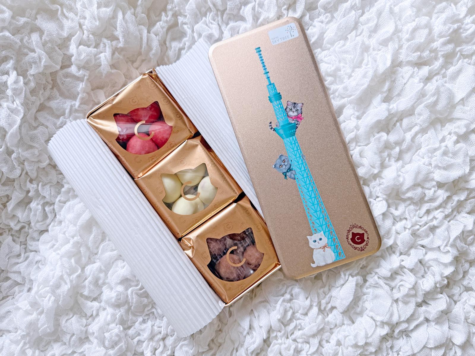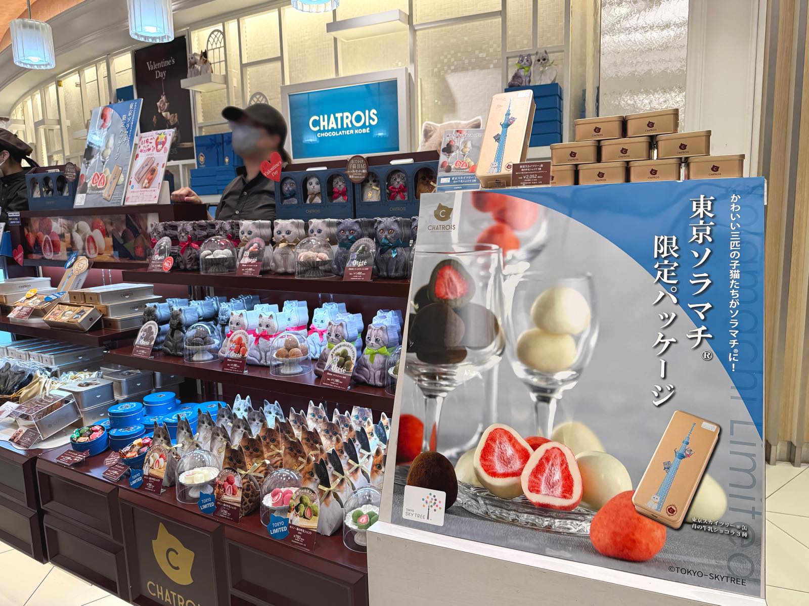 ギフトも充実しています。東京ソラマチ2F、タワーヤード6番地「シャトロワ」にはソラマチ限定の「東京スカイツリー®缶 苺の牛乳ショコラ 3種」(2052円)がお目見え。東京スカイツリーによじ登る猫たちがニャンとも可愛い!