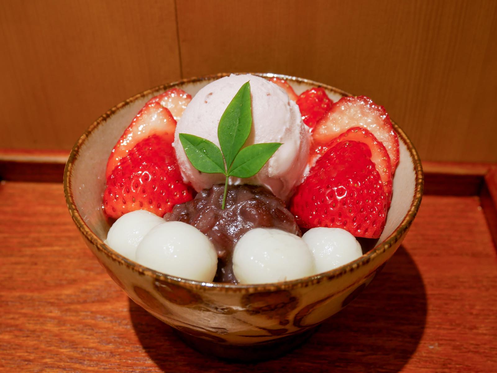 白玉あんみつにたっぷりのいちごといちごアイスクリーム。ソースは練乳と黒蜜から選べます。正直どちらもおいしそう。注文時は魂でチョイスしてください……! 和の甘味といちごってどこまでも好相性ですよね。ほっとひと息つけました。