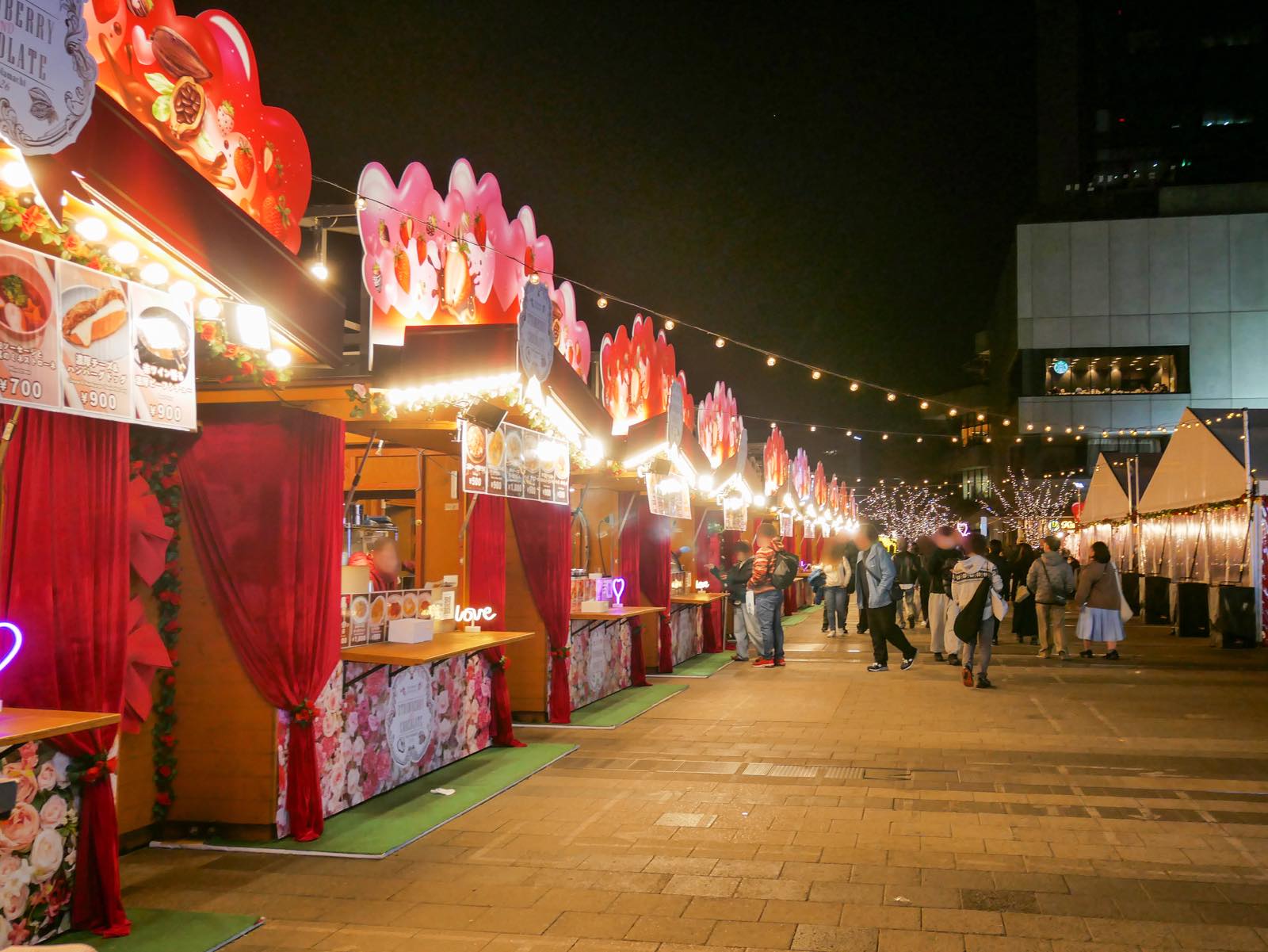クリスマスマーケットや台湾祭なども実施される屋外のスカイアリーナは、リボンやバラ、いちごやチョコをモチーフにした飾りつけで会場全体がゴージャス! さまざまなスイーツや食事メニューを提供するヒュッテがズラリと並びます。