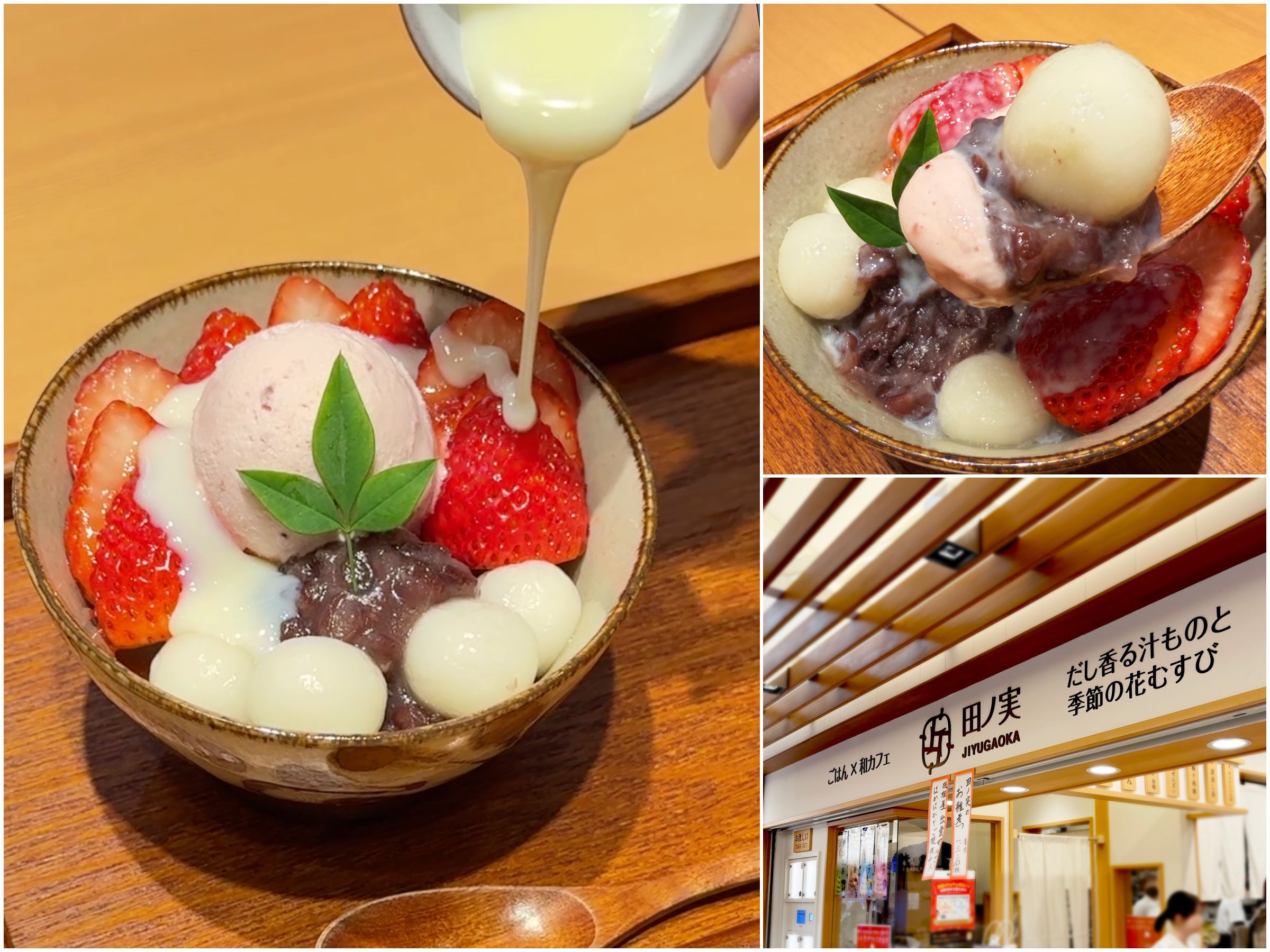 東京ソラマチ1F、イーストヤード10番地「田ノ実」。自由が丘発祥で具だくさんのお汁物やおむすびがいただけるこちらのお店で、ソラマチ限定・数量限定の「いちご雪見あんみつ」(1100円)をいただきました。
