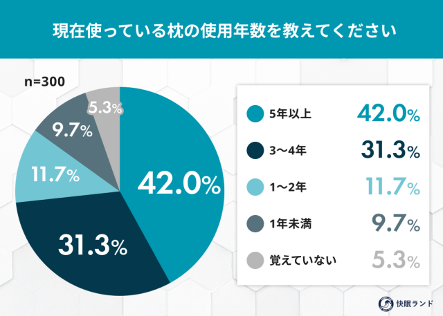 それによると、現在使っている枕の使用年数で最多だったのが「5年以上」(42.0%)。そして全体の7割以上が3年以上同じ枕を使っているという結果になりました。