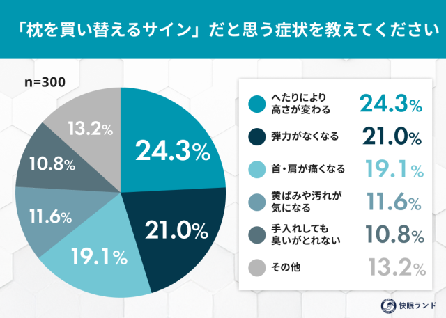 「枕を買い替えるサイン」として多かった回答は「へたりにより高さが変わる」(24.3%)、「弾力がなくなる」(21.0%)、「首・肩が痛くなる」(19.1%)あたり。年数よりも「機能の劣化」や「身体への影響」を買い替えの判断基準にしている人が多いようです。