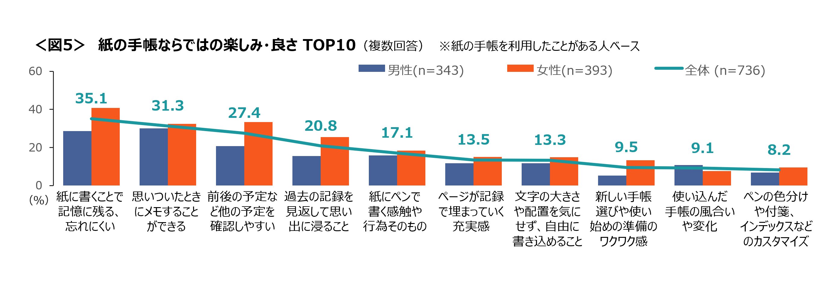 そのいっぽうで、年齢が上がるほど「(紙の手帳を)継続して使っている」割合が高くなるのだとか。また、紙の手帳を愛用している人の68.3%が「5年以上使い続けている」と回答していました。