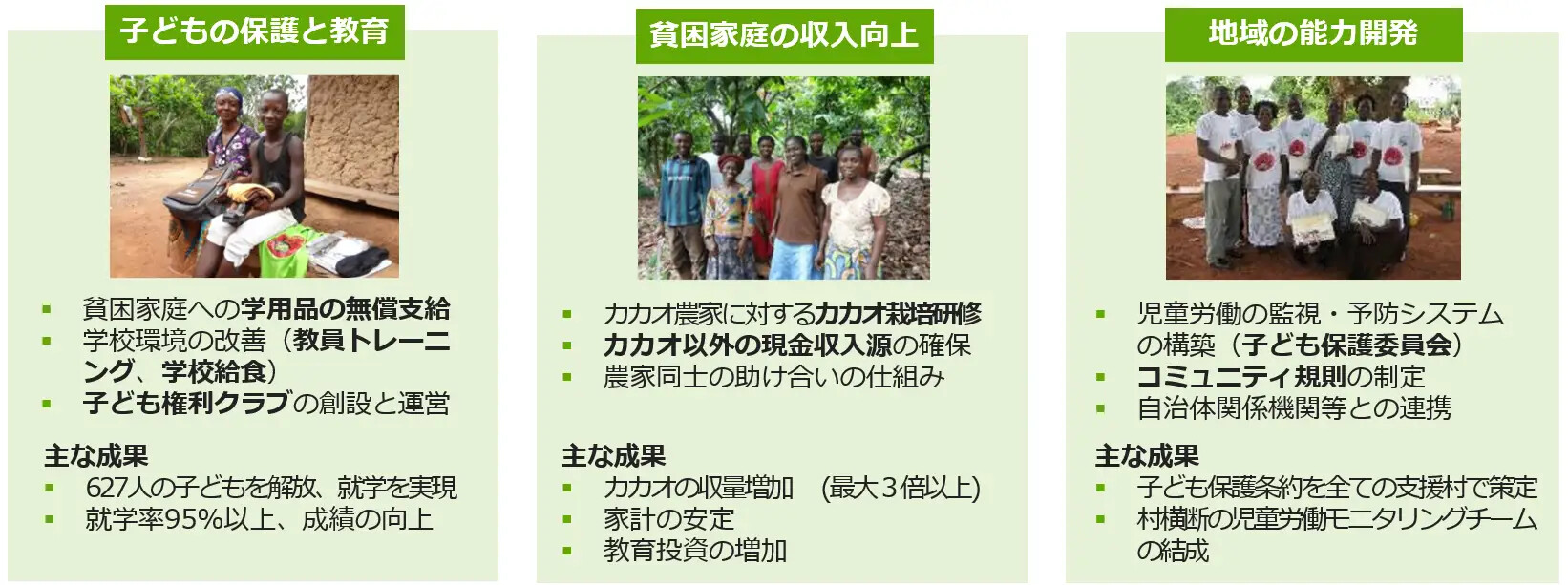 対象となるチョコレートを購入すると、その売上の一部が企業からACEへ寄付され、ガーナのカカオ農園で児童労働から子どもたちを守る活動に活用されます。