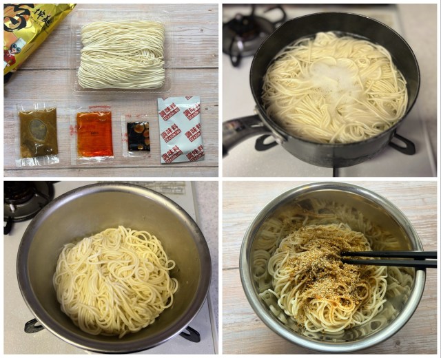 まずは沸騰したお湯にめんを入れ、5~6分茹でたら、油切りしためんをボウルに入れて、ラー油→しょう油→ごまだれ→シーズニングの順に入れて、大さじ1のお湯を入れてよく混ぜ合わせたら完成! 最後にお湯が必要なので、ゆで汁を少し残しておいてくださいね。