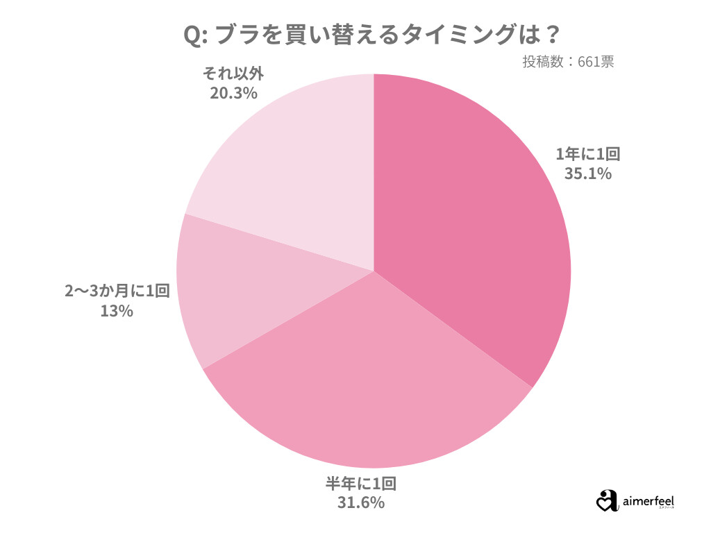 aimerfeel公式Instagramにて実施した調査によると、ブラを買い替えるタイミング1位は「1年に1回の買い替え」、次いで「半年に1回」「2〜3カ月に1回」と続きます。なお、平均は「8カ月に1回」でした。