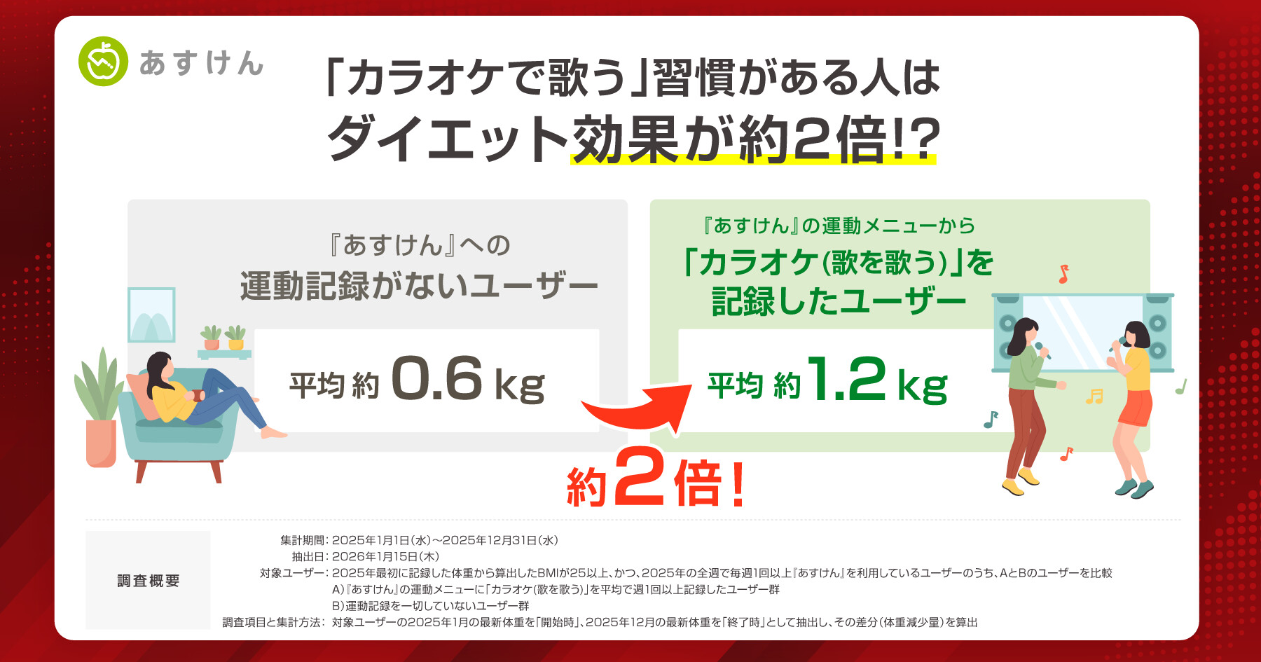 もしもそんなジレンマに悩んでいるのなら「カラオケ」に行くのはどう? というのも、あすけんによると「カラオケで歌う習慣がある人はダイエット効果が約2倍」あるというのです。