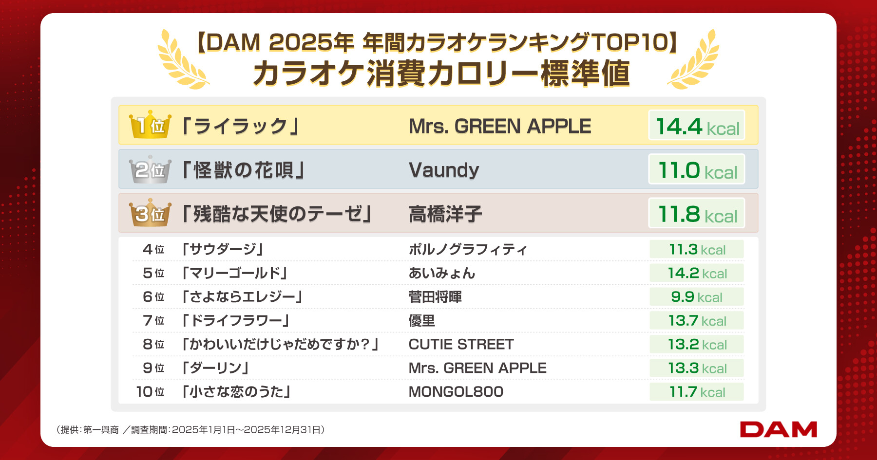 ■DAM 2025年年間カラオケランキングTOP10&カラオケ消費カロリーの標準値