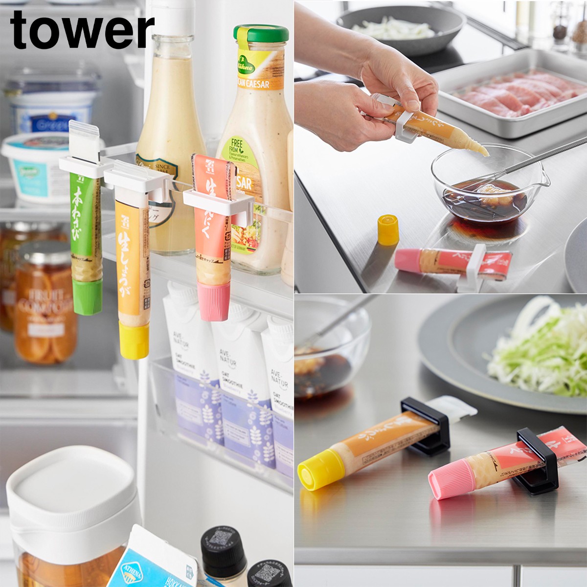 冷蔵庫のサイドポケットのフチに引っ掛けて収納できる、薬味チューブホルダー。自立できないチューブをラクラク収納できちゃいます。しかも最後までしぼれる機能付き+空になった部分は折り曲げてホルダー内にしまえるの!