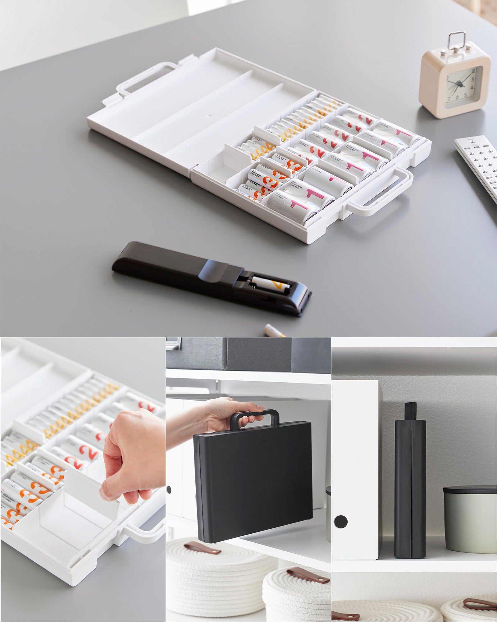 そのまま持ち運べるアタッシュケース型の電池ケース。電池の高さごとに3つの段に分けて収納できるため、ストックしている電池の種類と数がひと目でわかります。A4用紙よりコンパクト&スリムなサイズ、なおかつ自立するので収納も便利。