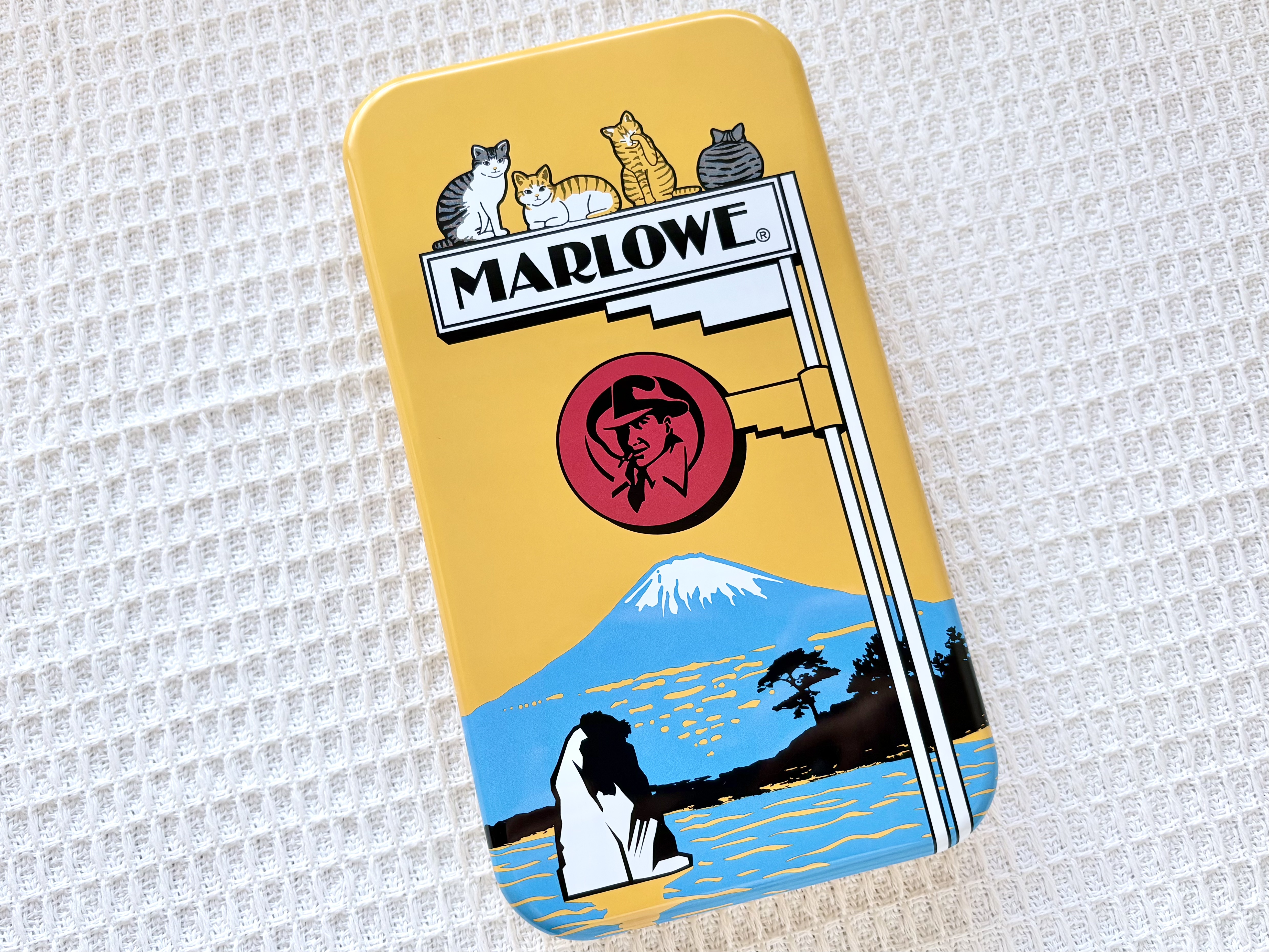 鮮やかなイエローが目をひく缶に描かれているのは、海沿いに佇むマーロウ本店の看板と、そこから望む富士山の絶景、そして看板の上でくつろぐネコちゃんたち!