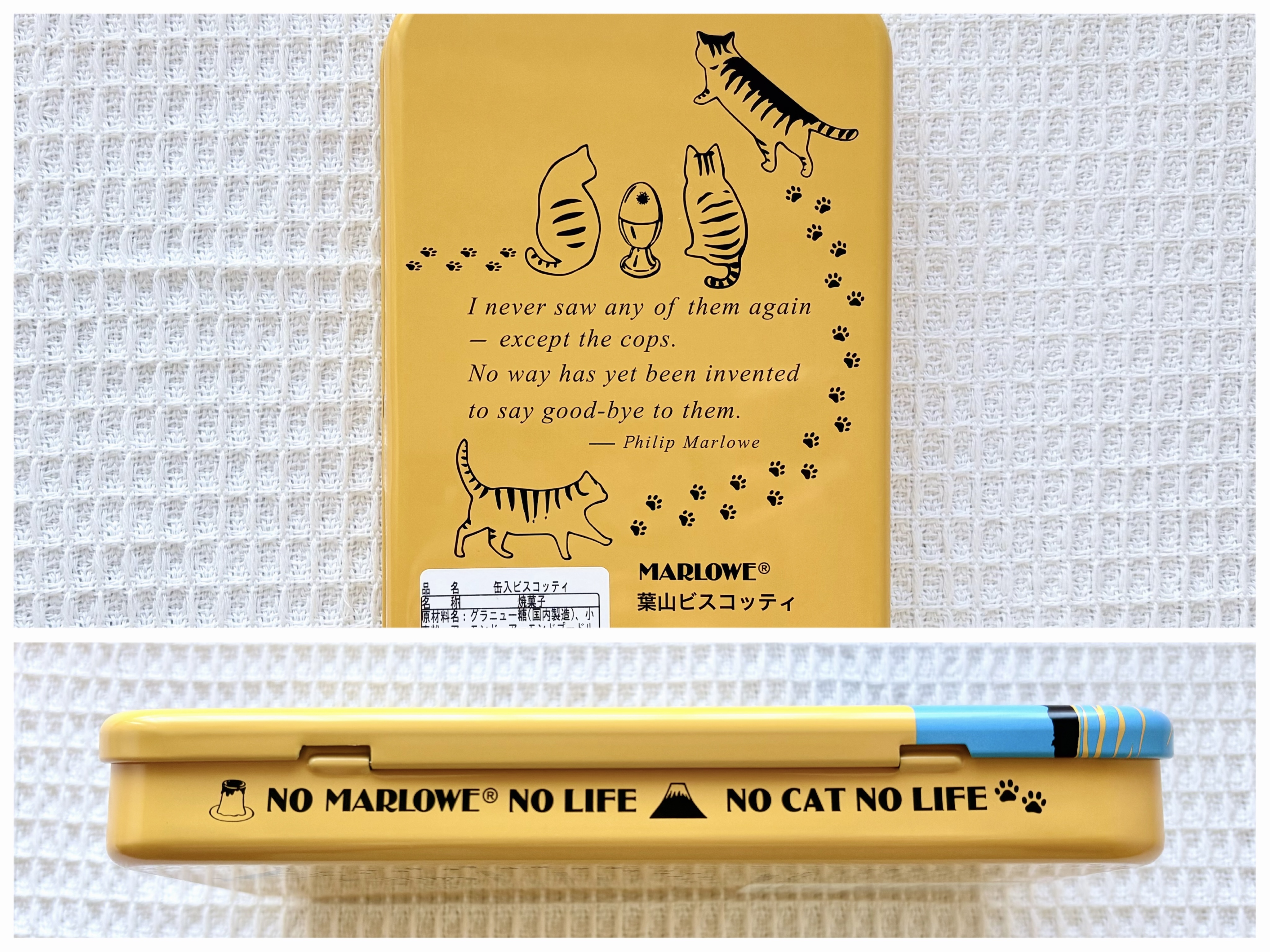 まだまだ、これだけじゃありませんよ。缶の側面に目を向けると、そこには「NO MARLOWE NO LIFE」の言葉と共に「NO CAT NO LIFE」と書かれているではないですか! マーロウのネコ愛、半端ニャイんですけど〜!