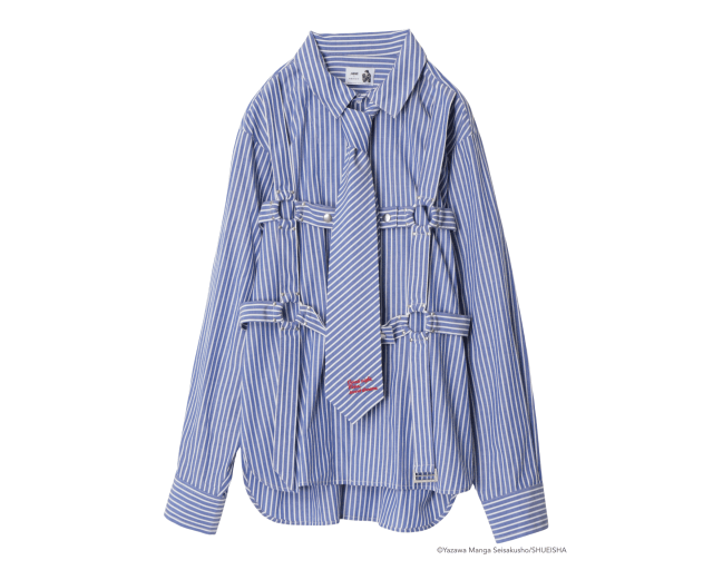作中でもエッジの効いたスタイルで異彩を放っていたシン。そのイメージを再解釈したシャツ(2万6000円)は、フロントに⾛る複数のベルトディテールや赤い刺繍が入ったネクタイが印象的です。
