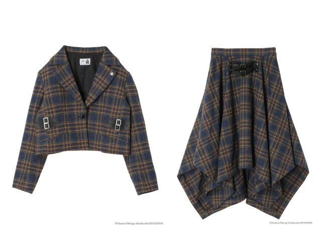 ナナの恋人でミュージシャンのレンからインスピレーションを受けて作られたのは、チェックのクラシカルな生地と黒いレザーの切り替えが印象的なジャケット(4万8000円)。これはレンガ持つ「強さ」と「もろさ」の二面性を表現しているそう。