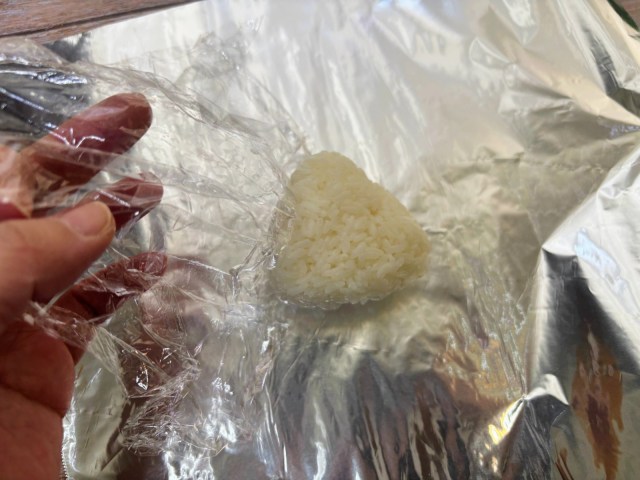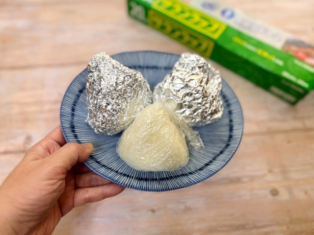これはおにぎりを握るときは扱いやすく破れにくいラップを使い、完成したら衛生的で食感も保てるアルミホイルに包みかえるというもの。こちらも実際にやってみましたが、ラップからアルミホイルに変えるのにひと手間かかる以外にデメリットは見当たらず、理にかなったとてもよい方法だと感じました。