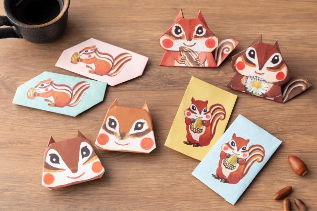 中には、1枚の紙を使って線の通りに折っていけば、リスを折ることができるおりがみ絵柄もありますよ~♪ 立体的なリスさんに思わずキュン。ちょっとした贈り物に添えてみるのはいかがでしょう?