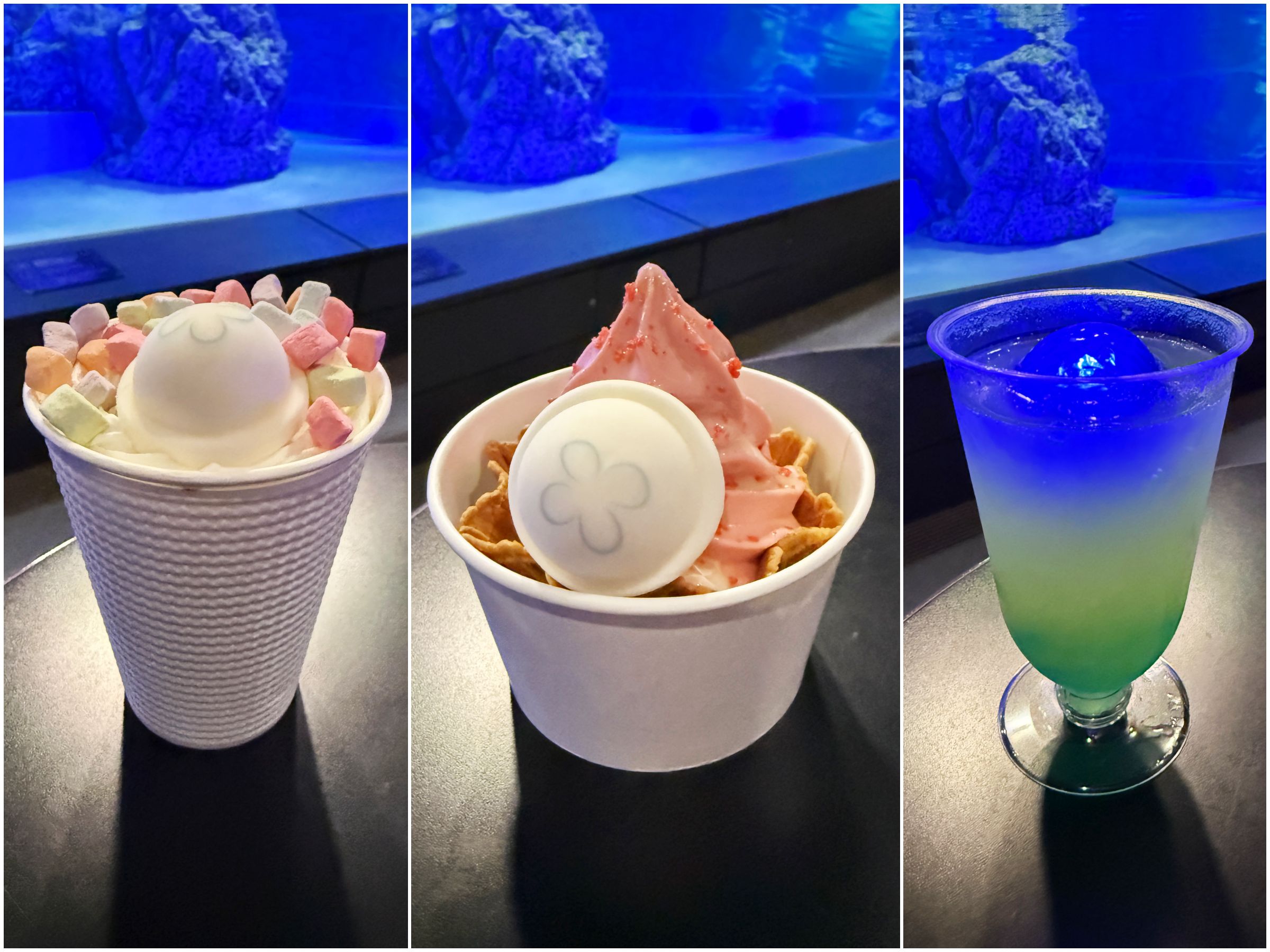 ドリンクはいずれも、アルコール入りもあるのがすごい。可愛さと大人の楽しみ、どっちも叶えてくれちゃいます。個人的イチオシは「ゆらめくクラゲバニララテ」。クラゲマシュマロにカラフルな乾燥マシュマロ、甘〜いラテでしあわせいっぱいのおいしさでした♡