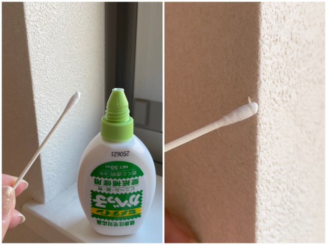 使い方は壁の汚れを軽く拭いてから、片面にかべっ子を塗り貼り付けるだけでOK。今回は塗る場所が小さかったため、はみ出さないように綿棒を使って塗ってみました。