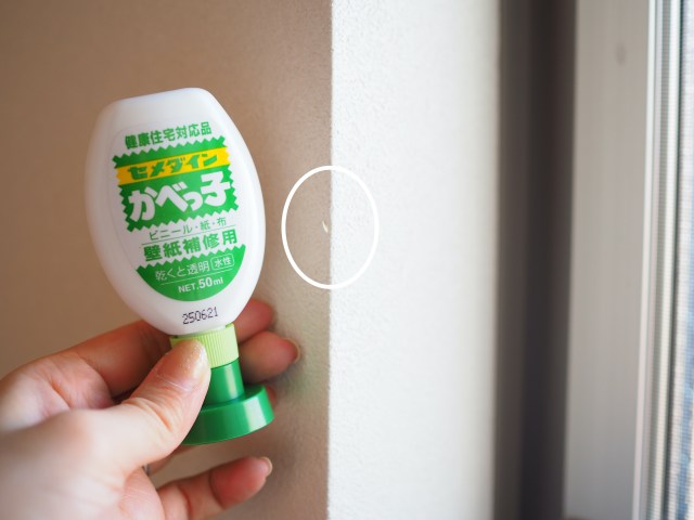 今回使ってみるのは壁の角にできた小さなめくれ箇所。我が家にはこれくらいの細かな壁紙の傷がちらほらあるのですが、目に入るたびにモヤモヤと気になっていたのです。