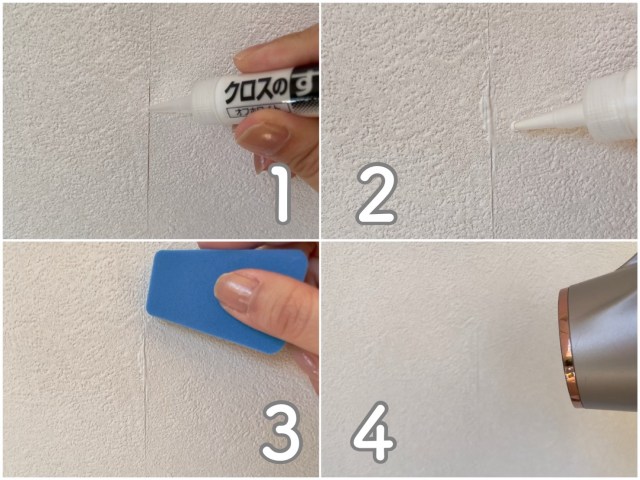 まずはクロスのすきまを埋めるように少しづつ注入します。はみ出した分は付属のスポンジで軽く拭き取ればOK。さらに凸凹のあるクロスの場合、乾く前にドライヤーで熱風を当てると膨張してより自然な見た目に仕上がるんですって!