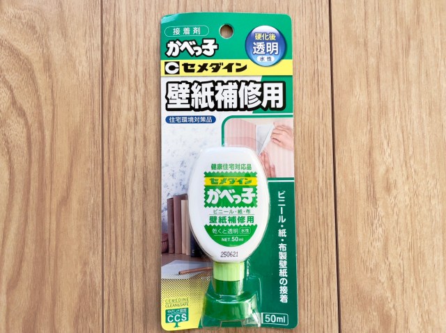 使うのはビニール・布・紙の壁紙に使えるセメダインの壁紙補修用接着剤「かべっ子」です。