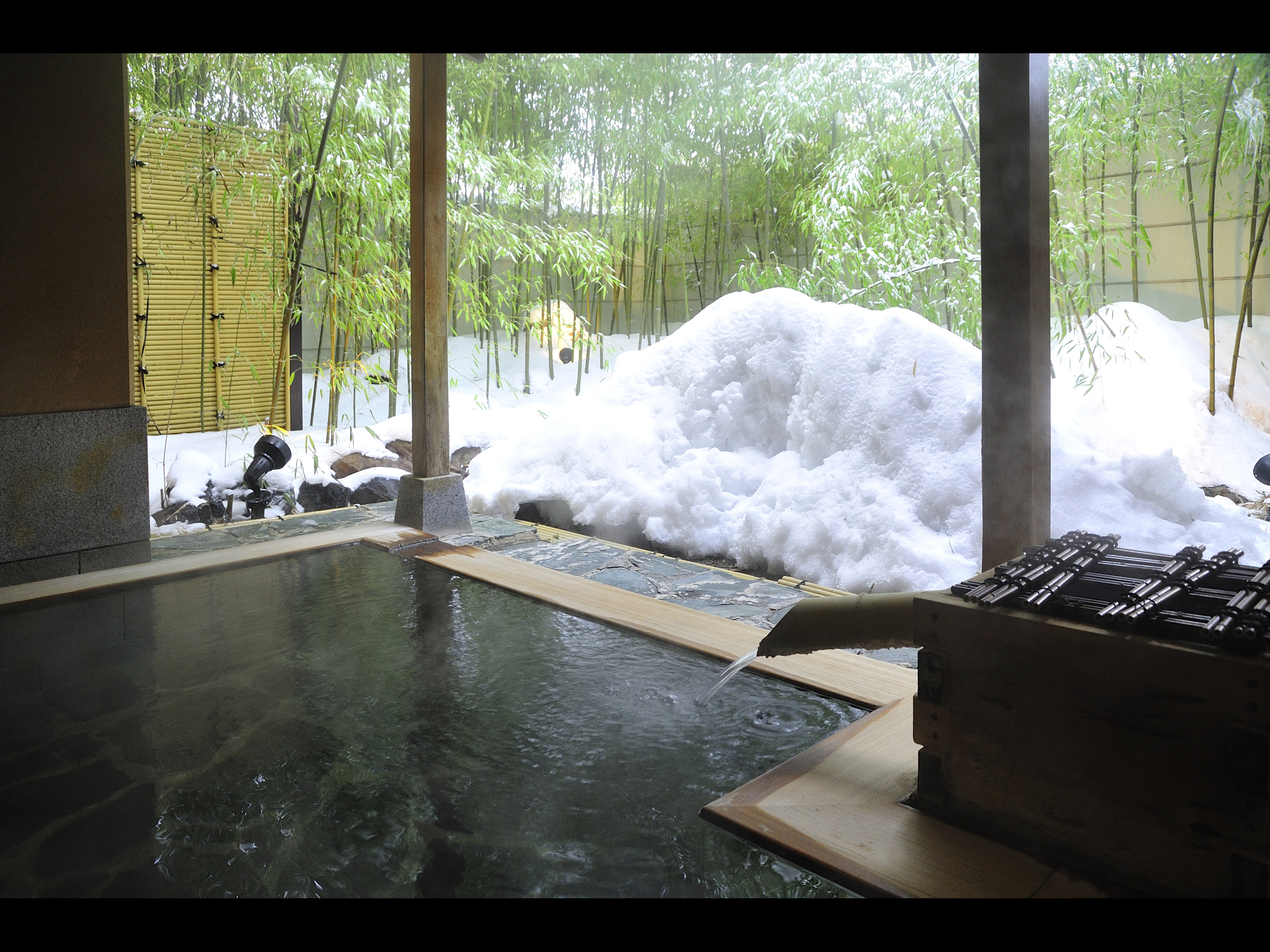 冬に行くなら、ライトアップされる竹林と雪のコントラストが美しい「竹林の湯」がおすすめなのだとか。枯山水の中庭、館内に焚かれるお香といった「和のおもてなし」も魅力的。函館駅から車で15分というアクセスの良さも最高です。