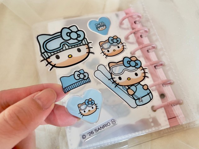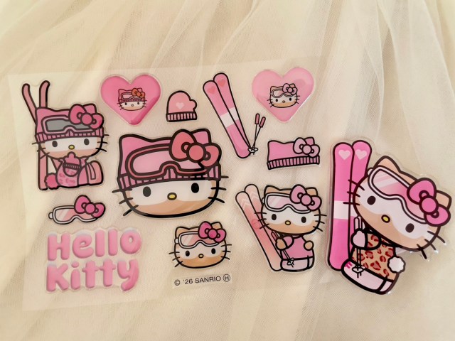 シールは1シートに11枚入りととっても豪華。ステッカーサイズの大きなものから、手袋やゴーグルなどの小物のシールまで揃っていて使い勝手もいい感じ。ちなみにどのキティちゃんももれなくゴーグル焼けスタイルです!