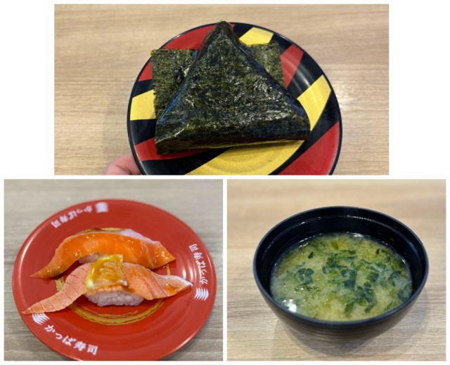 驚くべきことに、この3品を注文した時点でお会計は450円。おにぎり、サーモン2貫、味噌汁でですよ!?!? 「大切りサーモン食べ比べ」は対象メニューではないものの、やはり他2品が90円なのはデカい……! 軽いランチならこれでもじゅうぶん満足できそうです。