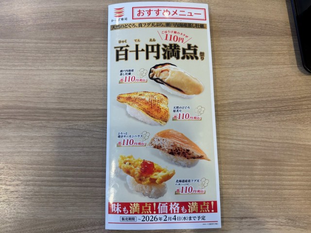 残り550円でこれだけ行けるのかって? 実は現在、かっぱ寿司では「百十円(ひゃくてんえん)満点祭り」というフェアもやっており、「塩炙りのどぐろ」が1貫110円という破格値なんです!