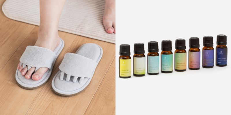 KEYUCAスタッフの皆さんは立ち仕事が多いため、疲れを翌日に持ち越さないようにすることを心がけているよう。履くだけでフットケアができるスリッパや、気分を整えるアロマを取り入れている人も。
