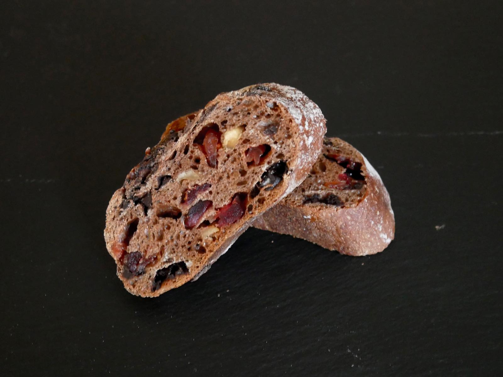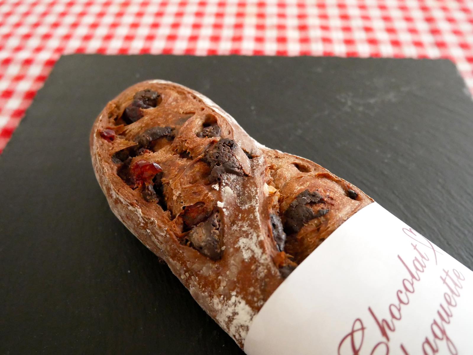 バゲットをカットすると断面もチョコたっぷりでさらにテンションが上ります。そのまま頬張ってみるとチョコレートのコクと香りが口の中に広がってなんとも至福。そこにクランベリーの甘酸っぱさ、ヘーゼルナッツの香ばしさが加わって完成された味わいだ……!