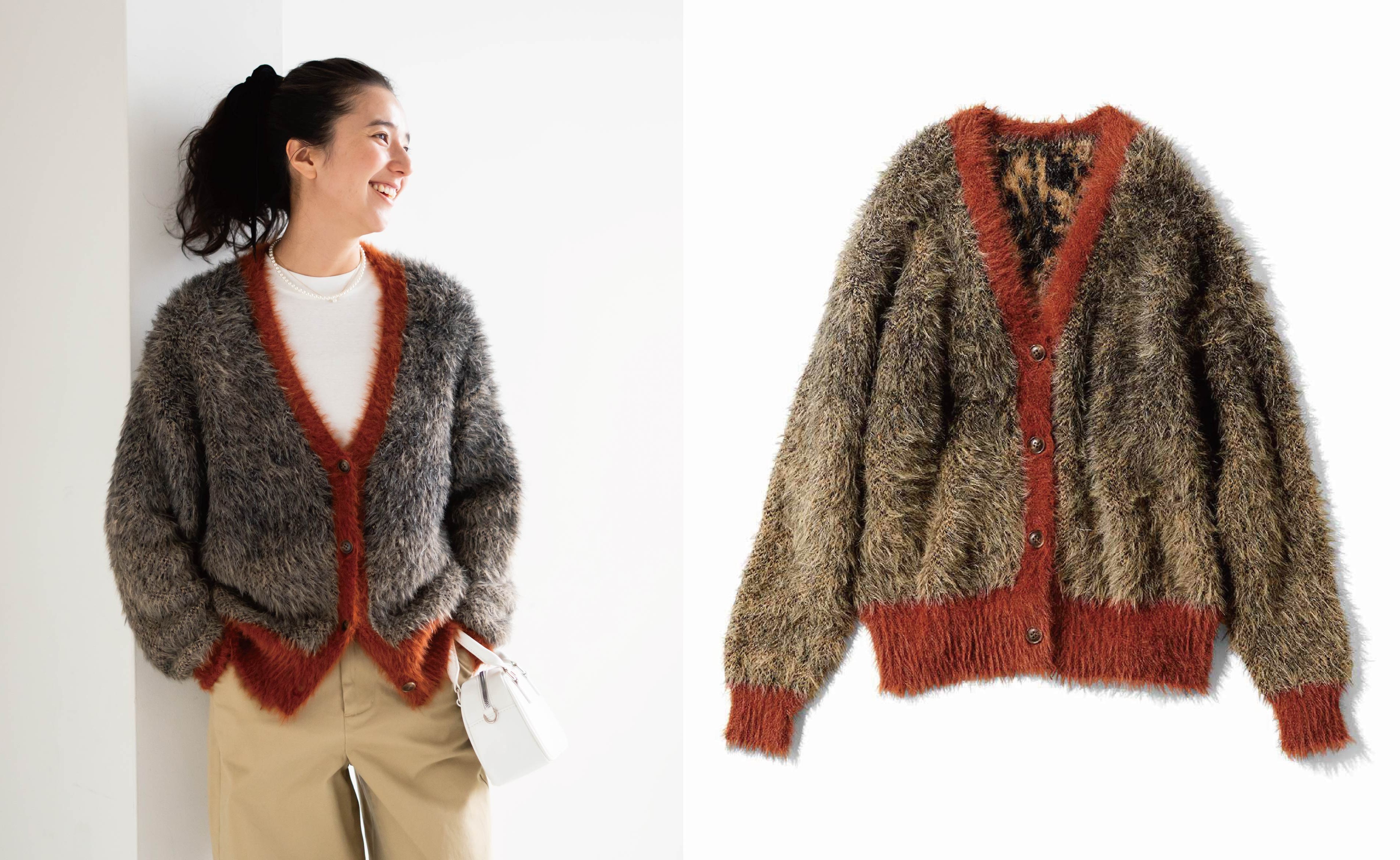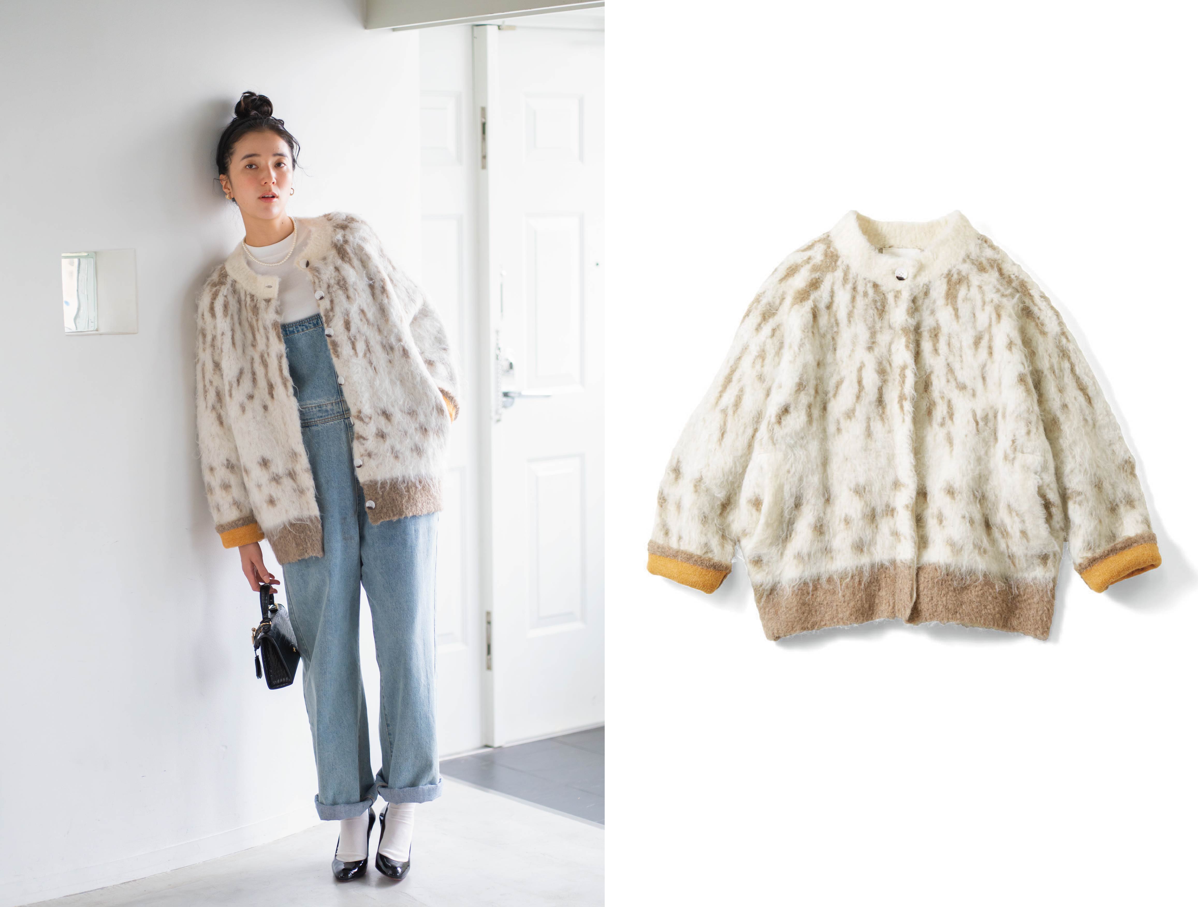ダチョウのひなの、ふわふわした産毛をイメージしたニットカーディガン。軽やかな着心地でありながらも、しっかり肉厚であたたかく、長い毛足がかわいらしい。アウターがわりにもなる存在感。