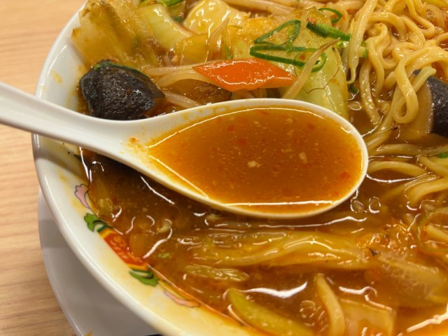 スープをひとくち飲んですぐ、「辛っ!!」というひとことが口をついて出てきました。唐辛子がかなり効いていて、これはもう激辛寄りの辛さです。