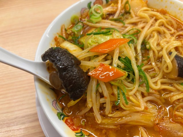 麺の上に乗った具材は、白菜にチンゲン菜、もやし、ニンジン、しいたけ、玉ねぎ……とバラエティ豊か。食べてみても、シャキシャキ食感を楽しめたり、スープが染み込んだくったり感に出会えたり。野菜の炒め具合が絶妙で、夢中で食べてしまいました♪