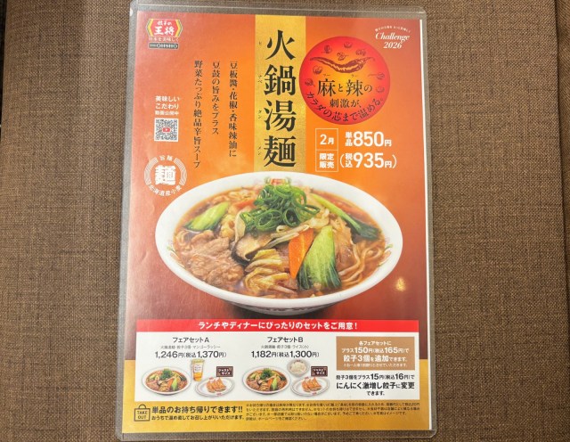 餃子の王将の「火鍋湯麺」は2月28日までの販売で935円。持ち帰りは918円+容器代に別途20円がかかります。