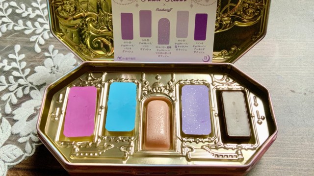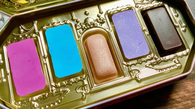 中央のピンク色とラベンダー色のチョコレートには銀粉が飾られていて、ラメのキラキラまで感じ取れます。