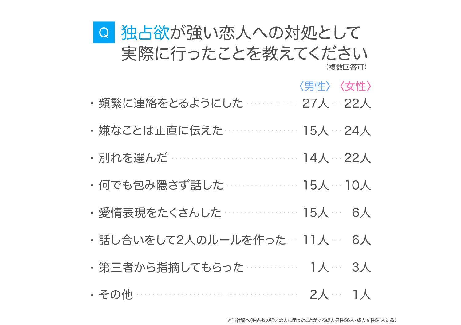 ところで、今回の調査では「独占欲が強い恋人への対処としておこなったこと」も明らかになっていました。