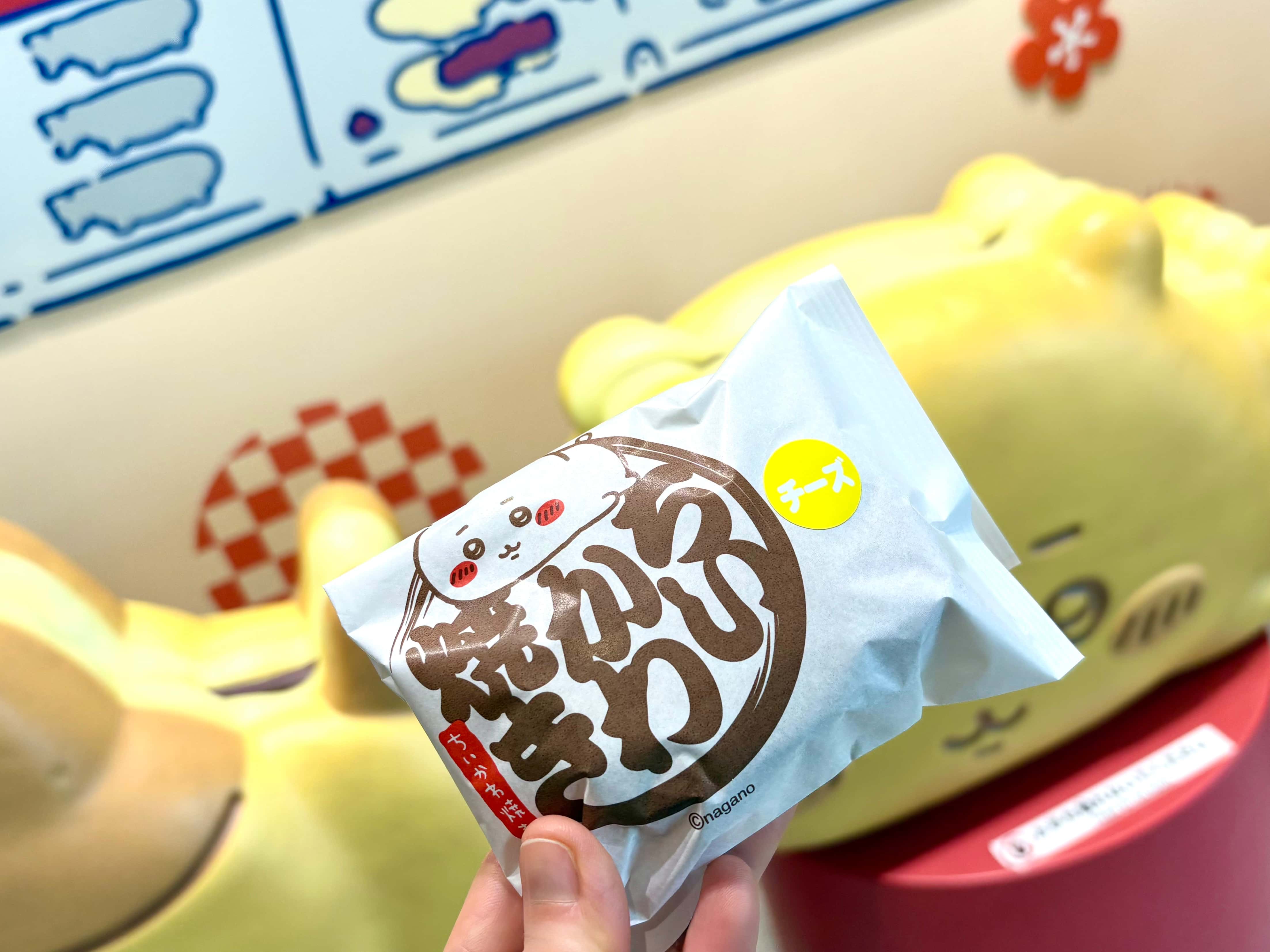 館内には自由に使える飲食スペースがあるので、そこでひと休みしつついただきます。期間限定商品という、ちいかわ型の生地の中にチーズが入ったタイプを食べたのですが、出来たてなのでアッツアツ!